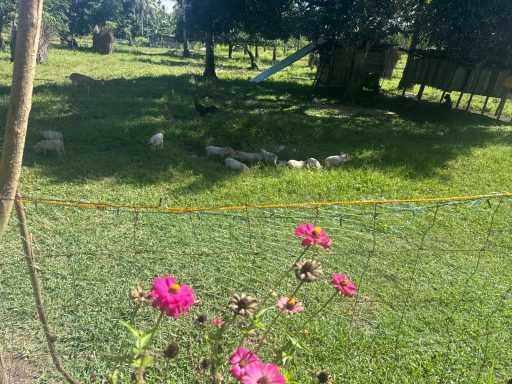 My house is located near the top of a mountain in a region south of Dahican called Bobon. It’s an Islamic center. A dirt path leads up about ¼ mile to the entrance of the 20-acre mango and coconut farm. A ¼ mile walking path winds up to my house in the center of the farm. As I sit here, I am within feet of one dog, one kitten, “Cassa”, one mother hen with 8 chicks, an arrogant rooster, my rooster, “Fido”, in his cage, three goats, and one very stubborn cow. All these animals are free-range.